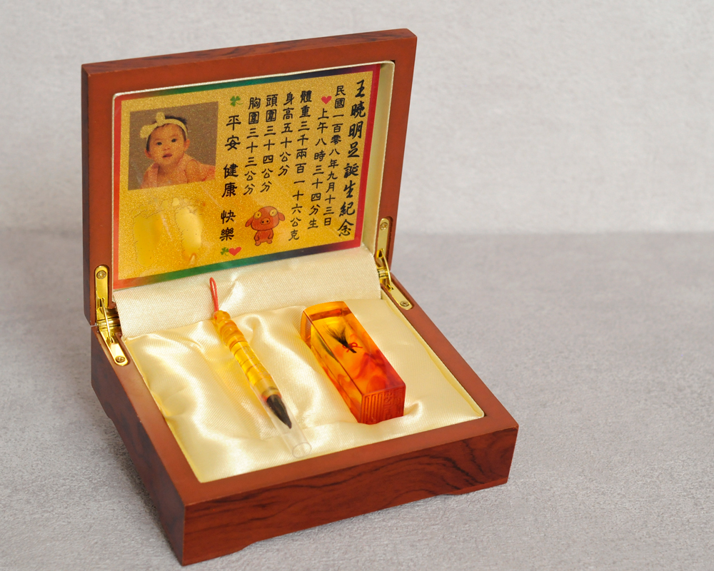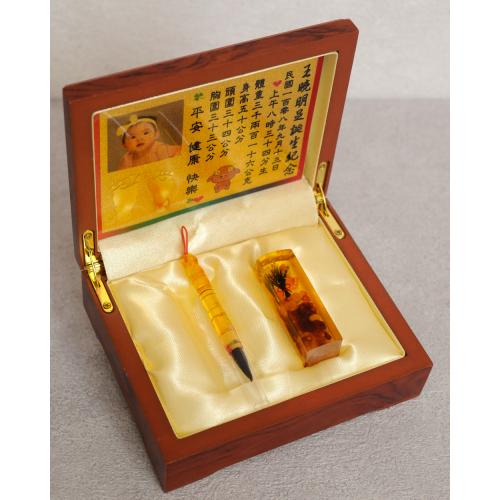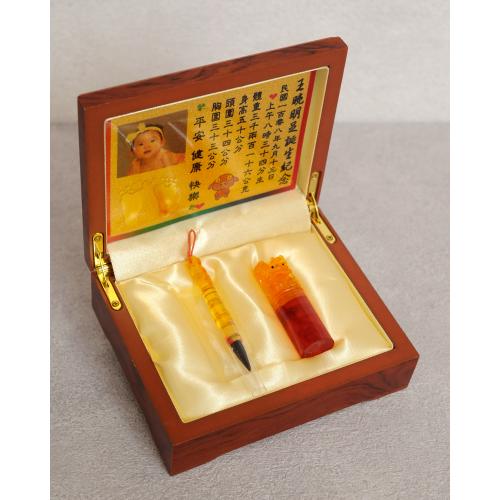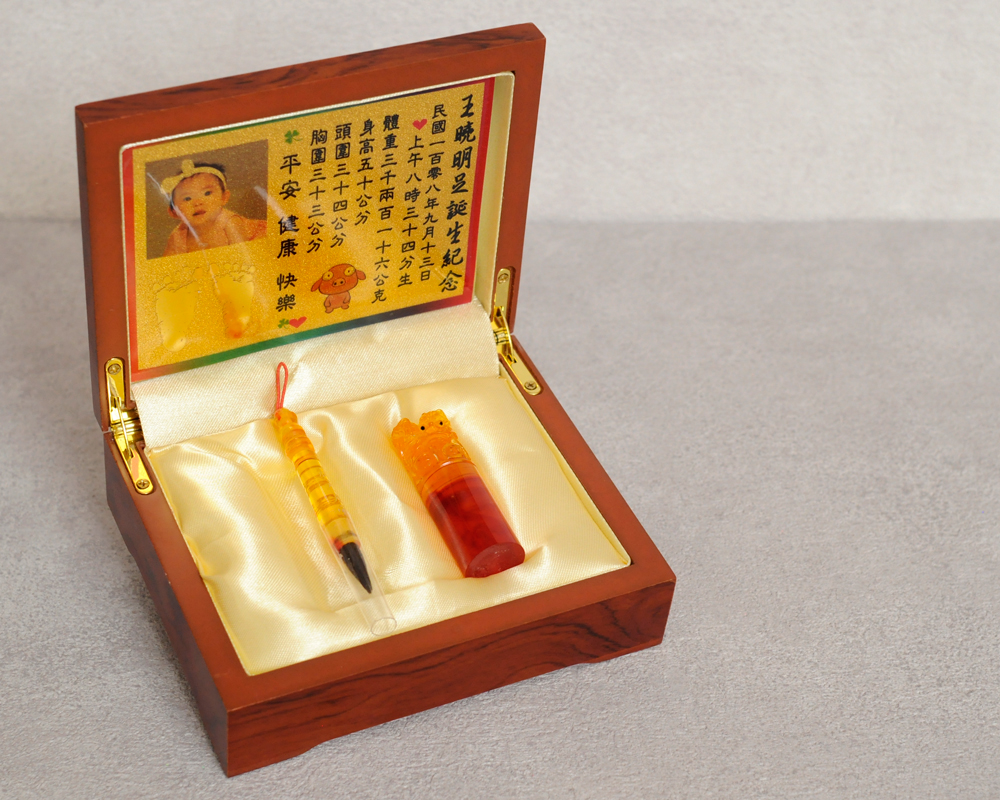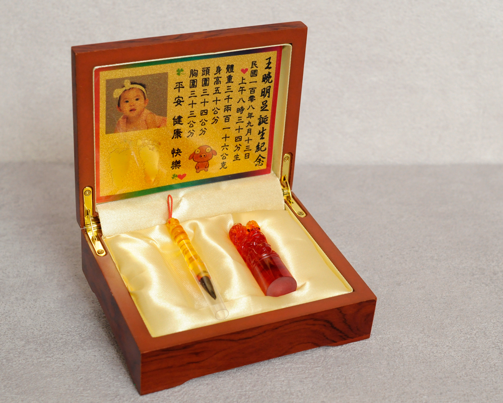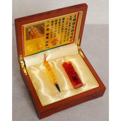 臍帶印章 / 嬰兒三寶組 - 琥珀 【琥珀】一印+小Q筆+金照片 $5400元 臍帶章規格: 請選擇臍帶章規格 6分 - 方 6分 - 圓 6分2寸半 - 圓 (加500元) 6分2寸半 - 方 (加500元) 臍帶章樣式: 請選擇臍帶章樣式 琥珀 原礦琥珀 (加1000元) 金漆雕刻+金箔 (加1100元) 心經-圓+金箔 (加1300元) 心經-方+金箔 (加1300元) 生肖琥珀 (加1500元) 原礦金箔琥珀 (加1700元) 生肖金箔琥珀 (加2000元) 金漆雕刻 (加500元) 金箔琥珀 (加700元) 心經-圓 (加700元) 心經-方 (加700元) 臍帶章-1 金漆雕刻款式(若無可跳過): 請選擇臍帶章-1 金漆雕刻款式(若無可跳過) 招財進寶(四個字) 招財進寶(圓盤) 財源廣進 永保安康 富貴平安 吉祥如意 富貴 平安 吉祥 如意 刻印字體-1: 請選擇刻印字體-1 印象體 小篆J3 小篆J5 小篆J7 行書S7 行書S5 毛行書S9 篆體J8 篆體J6 方角印篆A2 圓角印篆A3 魏碑體W5 古印體A05 隸書L5 隸書L7 明體M9 仿宋F5 正楷K9 毛楷K8 圓體R7 福體DF7 黑體B7 海報體P5 淡古文O6 順圓印篆 (加200元) 小Q筆材質: 請選擇小Q筆材質 綠檀 黑檀 紅紫檀 赤牛角 (加100元) 琥珀 (加100元) 生肖琥珀(若無可跳過): 請選擇生肖琥珀(若無可跳過) 鼠 牛 虎 兔 龍 蛇 馬 羊 猴 雞 狗 豬 刻印名字: 數量 - + 加入購物車 商品描述 1.商品製作時間為30~60個工作天,工作天不含六、日及國定假日,請確認沒有問題後再下單。 2.下單前建議加LINE@線上客服(帳號:@ahg1419i) 3.商品為純手工製作,故請依實品為主。 4.價格如有異動未能及時更新,以本公司實際販售價格為主,請見諒。 印章材質:琥珀 印章高度:兩吋長約6 cm / 兩吋半長約7.5 cm 印面尺寸:約1.8cm x 1.8cm 給媽咪的紀念,送寶貝的祝福~傳家珍藏象徵孩子出生、媽媽辛苦懷胎十月的胎毛與臍帶。臍帶章、胎毛章、髮臍章是祝福寶貝平安健康的長大,一輩子最好的紀念禮物、滿月禮物。 唯原工藝肚臍印章的刻印工法有:純手工刻印印章、半手工刻印印章、純手工噴砂玉石礦石印章、半手工噴砂玉石礦石印章、電腦刻印。台南在地刻印老店數十年的刻印經驗,傳承職人精神,專注刻印品質與細節,每顆印章都值得您細心品味,每顆印章都值得您傳家珍藏。 嚴選【琥珀】臍帶章 唯原工藝【臍帶章】給寶貝的第一份禮物,永恆的愛與祝福。嚴選【琥珀】特A級品質,全方位滿足每一位爸爸媽媽,為寶貝挑選第一份禮物,製作最具實用及紀念價值的滿月禮嬰兒三寶。給媽媽的紀念;送給寶寶的祝福, 珍藏象徵寶寶出生、成長;媽媽懷胎十月的出生胎毛與臍帶,祝福寶寶平安健康的長大,肚臍章是給寶貝最好的紀念禮物。 商品組合:肚臍章x1、小Q筆x1、金照片x1、木盒x1 琥珀 金箔琥珀 原礦金箔琥珀 生肖雕刻琥珀 >>查看生肖樣式請點我<< 生肖雕刻琥珀 >>查看生肖樣式請點我<< 小Q筆材質 加碼贈品 每人限定一份,贈品內容:防撞布包x1 贈品款式為隨機出貨,下圖為示意圖,贈品款是以實際收到的為主。 琥珀臍帶章 ★新生兒的胎毛頭髮在台語的發音為「發」,臍帶的台語發音為「肚財」並取財為主,將二者同時放在一方一圓的印章中即為發財印章,所以這是給新生兒最好的禮物。 ★乳牙象徵含義有「咬錢入庫」,這些都象徵家人對著新生兒的祝福與期待。以民間習俗來說,若製作一對臍帶胎毛章,圓章放臍帶,方章放胎毛;若是製作單章會將胎毛、臍帶一起放。圓章、方章的應用上,「圓章」適合用在流動性資產,例如銀行開戶、基金股票投資、圓形的意象也有「錢滾錢」的象徵;「方章」則是用在不動產、商業合約等用途,有關信用、誠信,方形「方方正ˋ正、四平八穩」的形象,有如守信、永恆不變的象徵。 【琥珀】臍帶章 天然印材 獨特唯一 琥珀顏色、紋路、斑點均為自然生成,每個琥珀印材都是獨一無二的,建議加LINE@線上客服詢問(帳號:@ahg1419i) 【琥珀】臍帶章 字體選擇 【琥珀】肚臍章-尺寸說明 加購【高級檀木印章盒】 材質有頂級紫光黑檀木與頂級紅紫檀木,印章章盒規格齊全,建議加LINE@線上客服(帳號:@ahg1419i) ,客服可提供檀木印章盒照片。