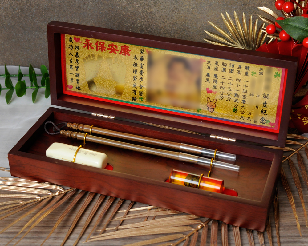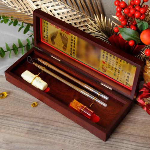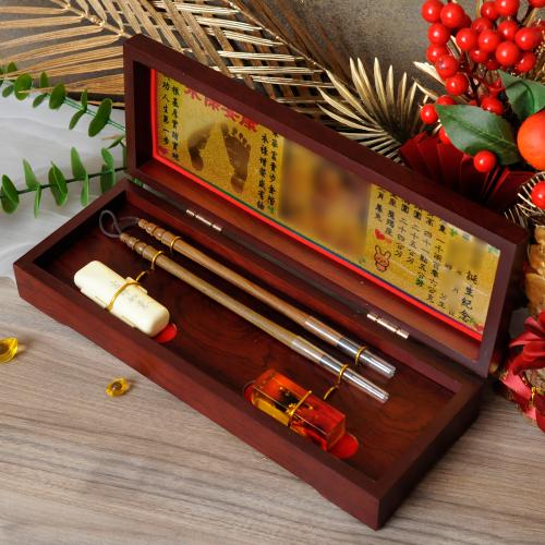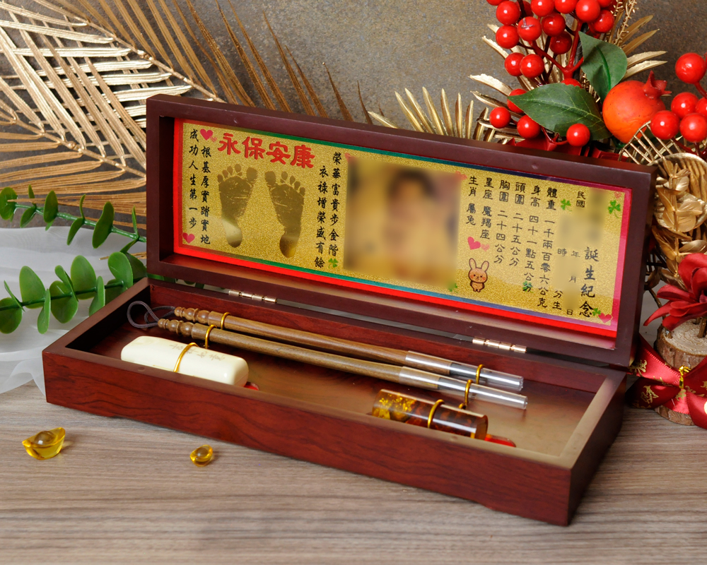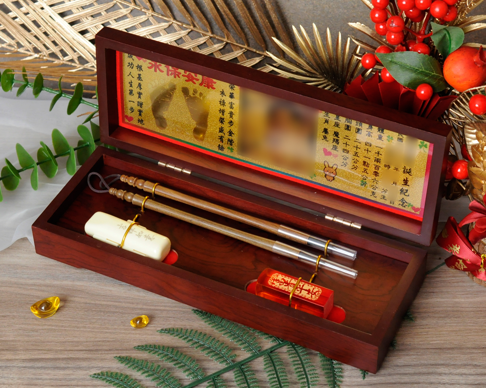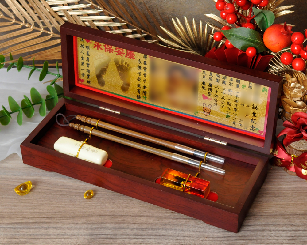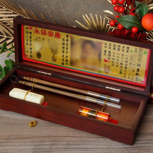 臍帶印章 / 嬰兒三寶組 - 琥珀 【琥珀】一印+二筆+金照片 $7400元 臍帶章規格: 請選擇臍帶章規格 6分 - 方 6分 - 圓 6分2寸半 - 圓 (加500元) 6分2寸半 - 方 (加500元) 臍帶章樣式: 請選擇臍帶章樣式 琥珀 原礦琥珀 (加1000元) 金漆雕刻+金箔 (加1100元) 心經-圓+金箔 (加1300元) 心經-方+金箔 (加1300元) 生肖琥珀 (加1500元) 原礦金箔琥珀 (加1700元) 生肖金箔琥珀 (加2000元) 金漆雕刻 (加500元) 金箔琥珀 (加700元) 心經-圓 (加700元) 心經-方 (加700元) 臍帶章-1 金漆雕刻款式(若無可跳過): 請選擇臍帶章-1 金漆雕刻款式(若無可跳過) 招財進寶(四個字) 招財進寶(圓盤) 財源廣進 永保安康 富貴平安 吉祥如意 富貴 平安 吉祥 如意 刻印字體-1: 請選擇刻印字體-1 印象體 小篆J3 小篆J5 小篆J7 行書S7 行書S5 毛行書S9 篆體J8 篆體J6 方角印篆A2 圓角印篆A3 魏碑體W5 古印體A05 隸書L5 隸書L7 明體M9 仿宋F5 正楷K9 毛楷K8 圓體R7 福體DF7 黑體B7 海報體P5 淡古文O6 順圓印篆 (加200元) 胎毛筆-1 樣式: 請選擇胎毛筆-1 樣式 綠檀 黑檀 紅紫檀 琥珀/赤牛角 (加100元) 胎毛筆-2 樣式: 請選擇胎毛筆-2 樣式 綠檀 黑檀 紅紫檀 琥珀/赤牛角 (加100元) 生肖琥珀(若無可跳過): 請選擇生肖琥珀(若無可跳過) 鼠 牛 虎 兔 龍 蛇 馬 羊 猴 雞 狗 豬 刻印名字: 數量 - + 加入購物車 商品描述 1.商品製作時間為30~60個工作天,工作天不含六、日及國定假日,請確認沒有問題後再下單。 2.下單前建議加LINE@線上客服(帳號:@ahg1419i) 3.商品為純手工製作,故請依實品為主。 4.價格如有異動未能及時更新,以本公司實際販售價格為主,請見諒。 印章材質:琥珀 印章高度:兩吋長約6 cm / 兩吋半長約7.5 cm 印面尺寸:約1.8cm x 1.8cm 給媽咪的紀念,送寶貝的祝福~傳家珍藏象徵孩子出生、媽媽辛苦懷胎十月的胎毛與臍帶。臍帶章、胎毛章、髮臍章是祝福寶貝平安健康的長大,一輩子最好的紀念禮物、滿月禮物。 唯原工藝肚臍印章的刻印工法有:純手工刻印印章、半手工刻印印章、純手工噴砂玉石礦石印章、半手工噴砂玉石礦石印章、電腦刻印。台南在地刻印老店數十年的刻印經驗,傳承職人精神,專注刻印品質與細節,每顆印章都值得您細心品味,每顆印章都值得您傳家珍藏。 嚴選【琥珀】臍帶章 唯原工藝【臍帶章】給寶貝的第一份禮物,永恆的愛與祝福。嚴選【琥珀】特A級品質,全方位滿足每一位爸爸媽媽,為寶貝挑選第一份禮物,製作最具實用及紀念價值的滿月禮嬰兒三寶。給媽媽的紀念;送給寶寶的祝福, 珍藏象徵寶寶出生、成長;媽媽懷胎十月的出生胎毛與臍帶,祝福寶寶平安健康的長大,肚臍章是給寶貝最好的紀念禮物。 商品組合:肚臍章x1、胎毛筆x2、金照片x1、木盒x1 琥珀 金箔琥珀 原礦金箔琥珀 生肖雕刻琥珀 >>查看生肖樣式請點我<< 金漆雕刻琥珀 加碼贈品 每人限定一份,贈品內容:防撞布包x1 贈品款式為隨機出貨,下圖為示意圖,贈品款是以實際收到的為主。 琥珀臍帶章 ★新生兒的胎毛頭髮在台語的發音為「發」,臍帶的台語發音為「肚財」並取財為主,將二者同時放在一方一圓的印章中即為發財印章,所以這是給新生兒最好的禮物。 ★乳牙象徵含義有「咬錢入庫」,這些都象徵家人對著新生兒的祝福與期待。以民間習俗來說,若製作一對臍帶胎毛章,圓章放臍帶,方章放胎毛;若是製作單章會將胎毛、臍帶一起放。圓章、方章的應用上,「圓章」適合用在流動性資產,例如銀行開戶、基金股票投資、圓形的意象也有「錢滾錢」的象徵;「方章」則是用在不動產、商業合約等用途,有關信用、誠信,方形「方方正ˋ正、四平八穩」的形象,有如守信、永恆不變的象徵。 【琥珀】臍帶章 天然印材 獨特唯一 琥珀顏色、紋路、斑點均為自然生成,每個琥珀印材都是獨一無二的,建議加LINE@線上客服詢問(帳號:@ahg1419i) 【琥珀】臍帶章 字體選擇 【琥珀】肚臍章-尺寸說明 加購【高級檀木印章盒】 材質有頂級紫光黑檀木與頂級紅紫檀木,印章章盒規格齊全,建議加LINE@線上客服(帳號:@ahg1419i) ,客服可提供檀木印章盒照片。