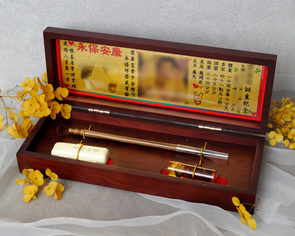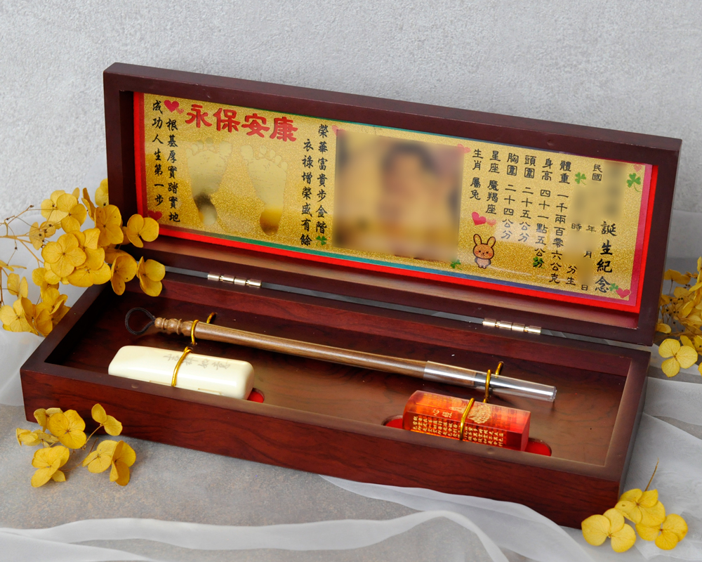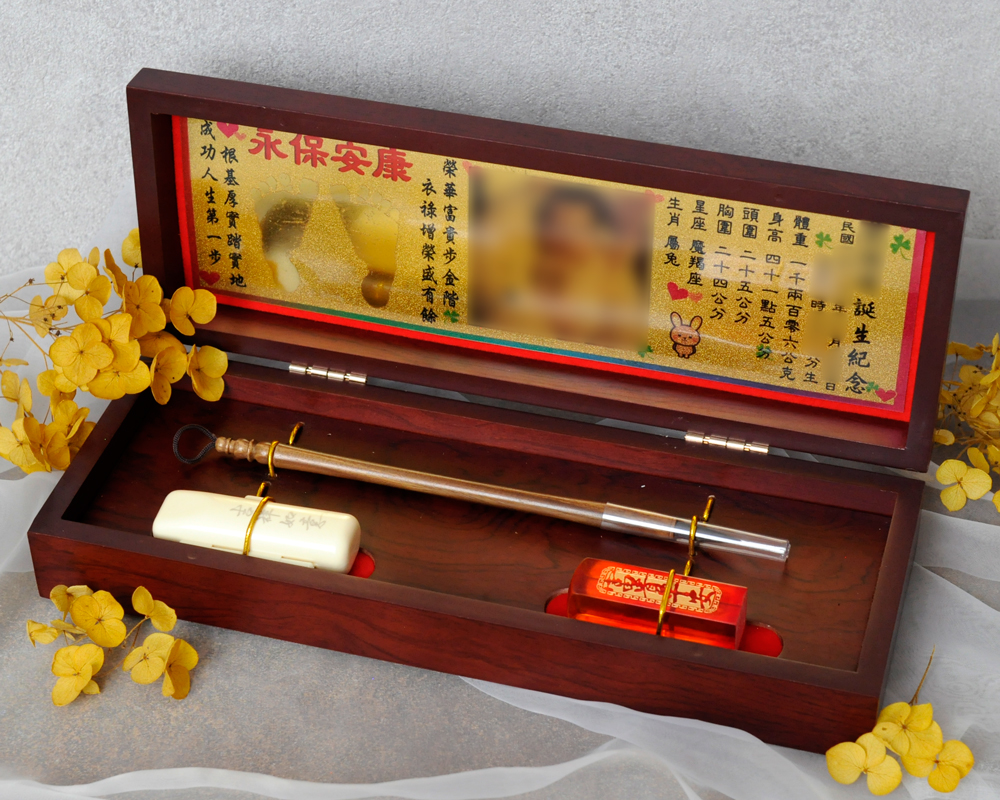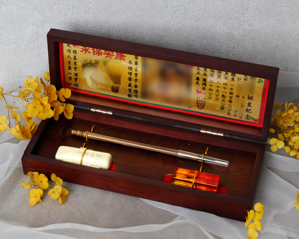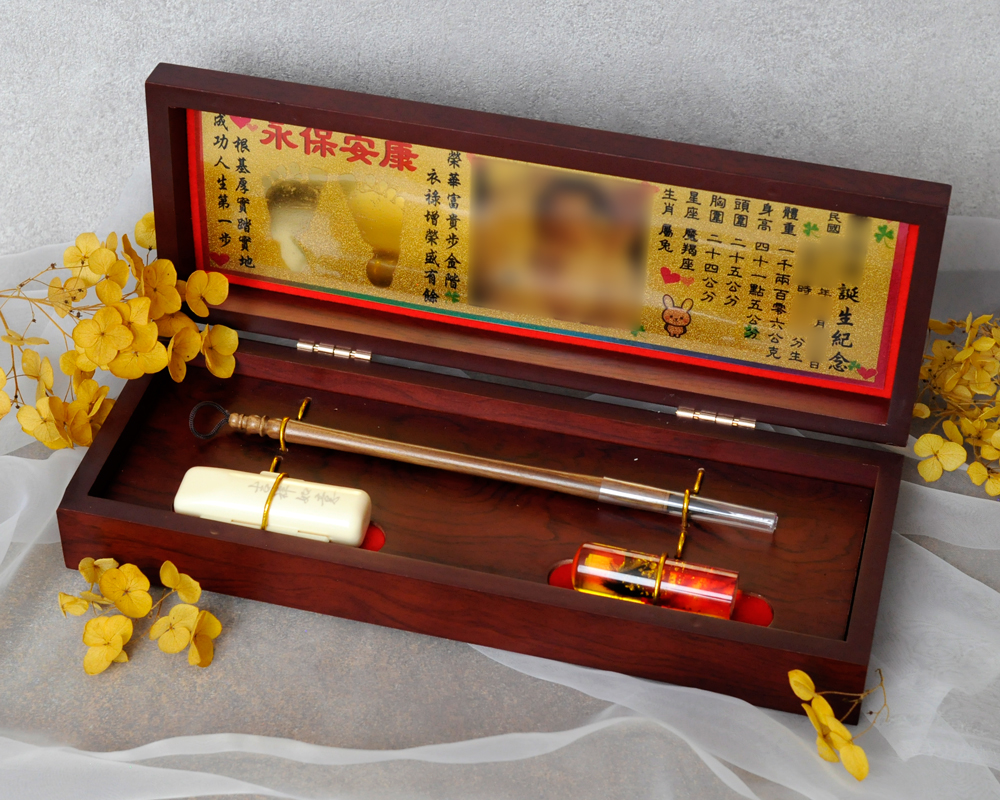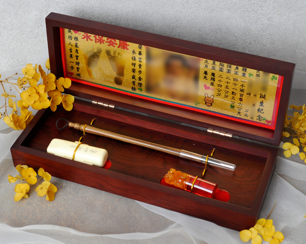 臍帶印章 / 嬰兒三寶組 - 琥珀 【琥珀】一印+一筆+金照片 $5600元 臍帶章規格: 請選擇臍帶章規格 6分 - 方 6分 - 圓 6分2寸半 - 圓 (加500元) 6分2寸半 - 方 (加500元) 臍帶章樣式: 請選擇臍帶章樣式 琥珀 原礦琥珀 (加1000元) 金漆雕刻+金箔 (加1100元) 心經-圓+金箔 (加1300元) 心經-方+金箔 (加1300元) 生肖琥珀 (加1500元) 原礦金箔琥珀 (加1700元) 生肖金箔琥珀 (加2000元) 金漆雕刻 (加500元) 金箔琥珀 (加700元) 心經-圓 (加700元) 心經-方 (加700元) 臍帶章-1 金漆雕刻款式(若無可跳過): 請選擇臍帶章-1 金漆雕刻款式(若無可跳過) 招財進寶(四個字) 招財進寶(圓盤) 財源廣進 永保安康 富貴平安 吉祥如意 富貴 平安 吉祥 如意 刻印字體-1: 請選擇刻印字體-1 印象體 小篆J3 小篆J5 小篆J7 行書S7 行書S5 毛行書S9 篆體J8 篆體J6 方角印篆A2 圓角印篆A3 魏碑體W5 古印體A05 隸書L5 隸書L7 明體M9 仿宋F5 正楷K9 毛楷K8 圓體R7 福體DF7 黑體B7 海報體P5 淡古文O6 順圓印篆 (加200元) 胎毛筆材質: 請選擇胎毛筆材質 紅紫檀 黑檀 綠檀 琥珀/赤牛角 (加100元) 生肖琥珀(若無可跳過): 請選擇生肖琥珀(若無可跳過) 鼠 牛 虎 兔 龍 蛇 馬 羊 猴 雞 狗 豬 刻印名字: 數量 - + 加入購物車 商品描述 1.商品製作時間為30~60個工作天,工作天不含六、日及國定假日,請確認沒有問題後再下單。 2.下單前建議加LINE@線上客服(帳號:@ahg1419i) 3.商品為純手工製作,故請依實品為主。 4.價格如有異動未能及時更新,以本公司實際販售價格為主,請見諒。 印章材質:琥珀 印章高度:兩吋長約6 cm / 兩吋半長約7.5 cm 印面尺寸:約1.8cm x 1.8cm 給媽咪的紀念,送寶貝的祝福~傳家珍藏象徵孩子出生、媽媽辛苦懷胎十月的胎毛與臍帶。臍帶章、胎毛章、髮臍章是祝福寶貝平安健康的長大,一輩子最好的紀念禮物、滿月禮物。 唯原工藝肚臍印章的刻印工法有:純手工刻印印章、半手工刻印印章、純手工噴砂玉石礦石印章、半手工噴砂玉石礦石印章、電腦刻印。台南在地刻印老店數十年的刻印經驗,傳承職人精神,專注刻印品質與細節,每顆印章都值得您細心品味,每顆印章都值得您傳家珍藏。 嚴選【琥珀】臍帶章 唯原工藝【臍帶章】給寶貝的第一份禮物,永恆的愛與祝福。嚴選【琥珀】特A級品質,全方位滿足每一位爸爸媽媽,為寶貝挑選第一份禮物,製作最具實用及紀念價值的滿月禮嬰兒三寶。給媽媽的紀念;送給寶寶的祝福, 珍藏象徵寶寶出生、成長;媽媽懷胎十月的出生胎毛與臍帶,祝福寶寶平安健康的長大,肚臍章是給寶貝最好的紀念禮物。 商品組合:肚臍章x1、胎毛筆x1、金照片x1、木盒x1 琥珀 金箔琥珀 原礦金箔琥珀 心經雕刻琥珀 生肖雕刻琥珀 >>查看生肖樣式請點我<< 金漆雕刻琥珀 加碼贈品 每人限定一份,贈品內容:防撞布包x1 贈品款式為隨機出貨,下圖為示意圖,贈品款是以實際收到的為主。 琥珀臍帶章 ★新生兒的胎毛頭髮在台語的發音為「發」,臍帶的台語發音為「肚財」並取財為主,將二者同時放在一方一圓的印章中即為發財印章,所以這是給新生兒最好的禮物。 ★乳牙象徵含義有「咬錢入庫」,這些都象徵家人對著新生兒的祝福與期待。以民間習俗來說,若製作一對臍帶胎毛章,圓章放臍帶,方章放胎毛;若是製作單章會將胎毛、臍帶一起放。圓章、方章的應用上,「圓章」適合用在流動性資產,例如銀行開戶、基金股票投資、圓形的意象也有「錢滾錢」的象徵;「方章」則是用在不動產、商業合約等用途,有關信用、誠信,方形「方方正ˋ正、四平八穩」的形象,有如守信、永恆不變的象徵。 【琥珀】臍帶章 天然印材 獨特唯一 琥珀顏色、紋路、斑點均為自然生成,每個琥珀印材都是獨一無二的,建議加LINE@線上客服詢問(帳號:@ahg1419i) 【琥珀】臍帶章 字體選擇 【琥珀】肚臍章-尺寸說明 加購【高級檀木印章盒】 材質有頂級紫光黑檀木與頂級紅紫檀木,印章章盒規格齊全,建議加LINE@線上客服(帳號:@ahg1419i) ,客服可提供檀木印章盒照片。