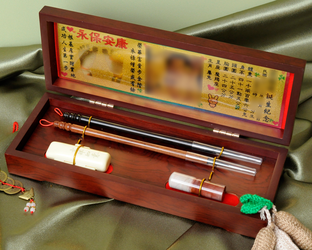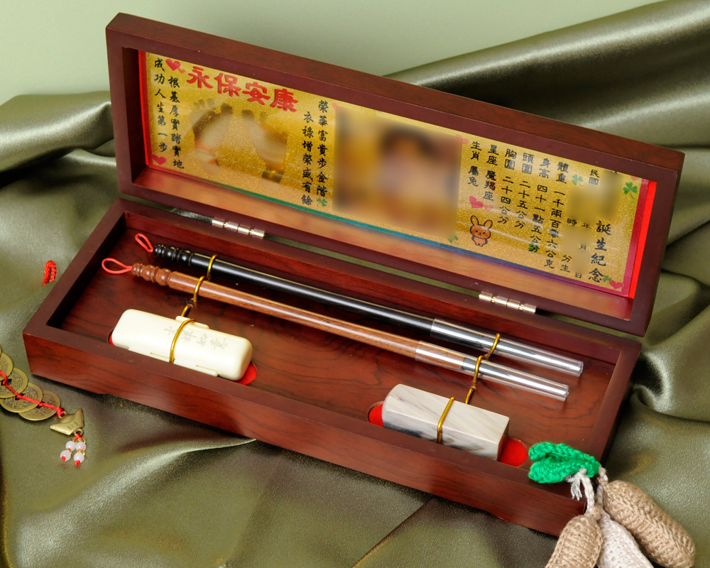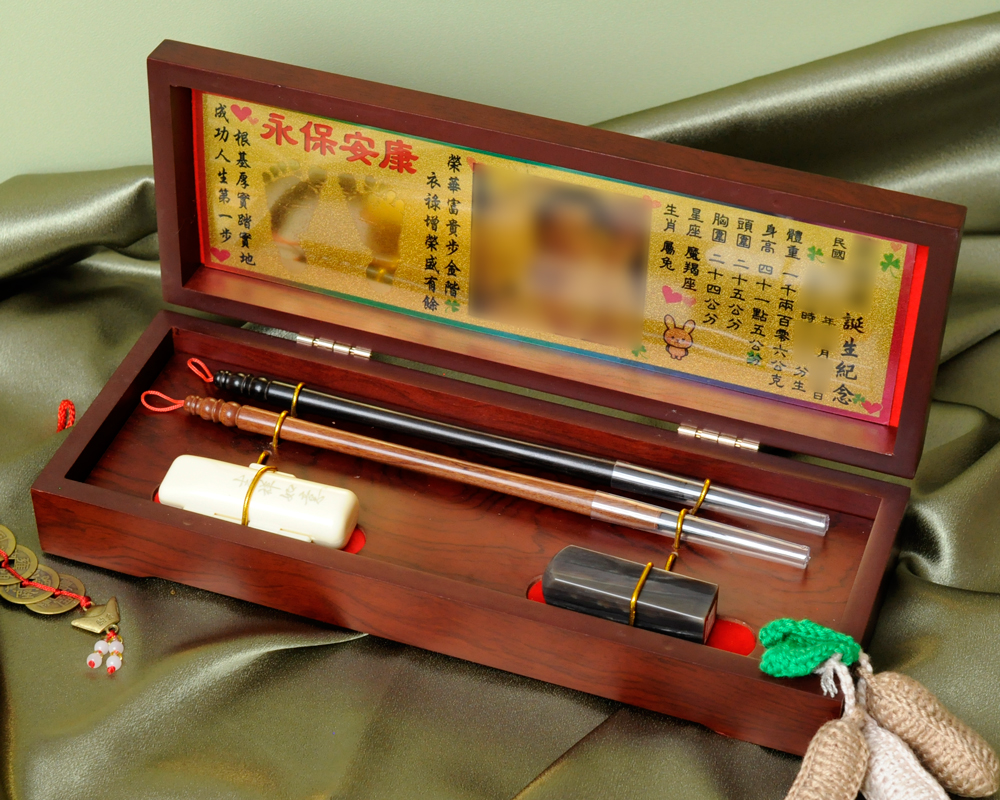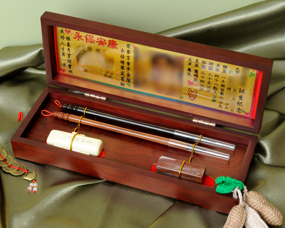 商品組合:肚臍章x1、胎毛筆x2、金照片x1、木盒x1