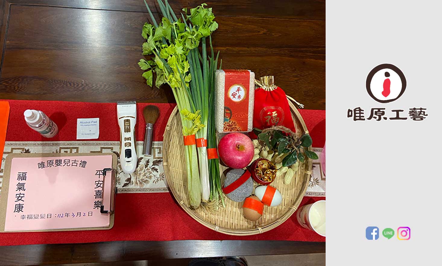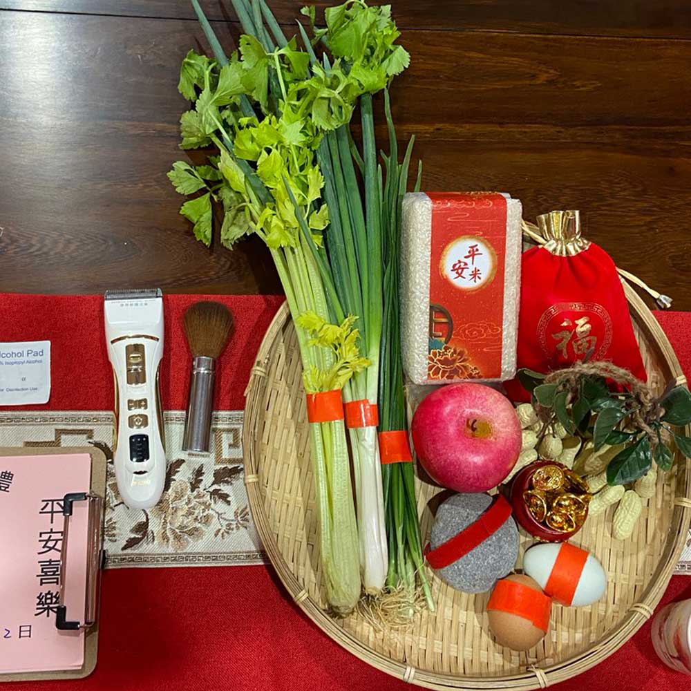家長需要自行準備:(蔥、韭菜、芹菜、熟雞蛋、熟鴨蛋、石頭、銅板、臉盆、紗布巾)。附註:若家長需要我們幫忙準備,則需額外收備品費用。
