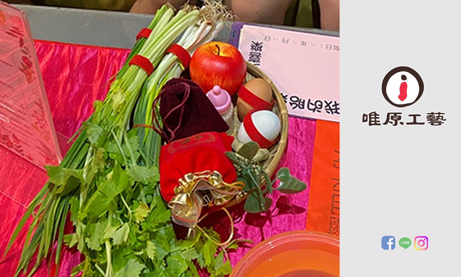 家長需要自行準備:(蔥、韭菜、芹菜、熟雞蛋、熟鴨蛋、石頭、銅板、臉盆、紗布巾)。附註:若家長需要我們幫忙準備,則需額外收備品費用。