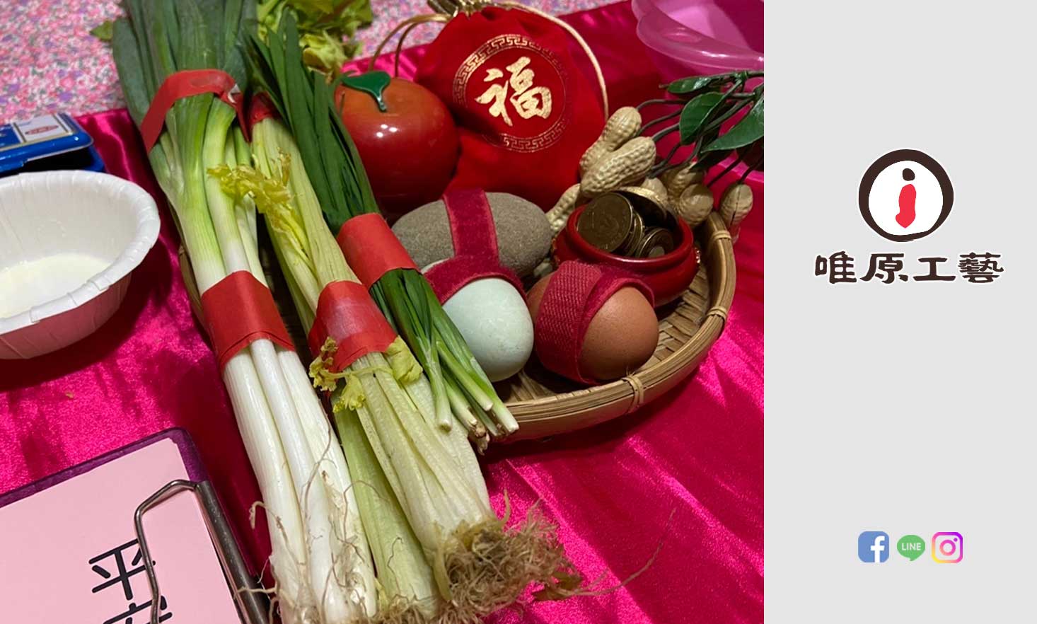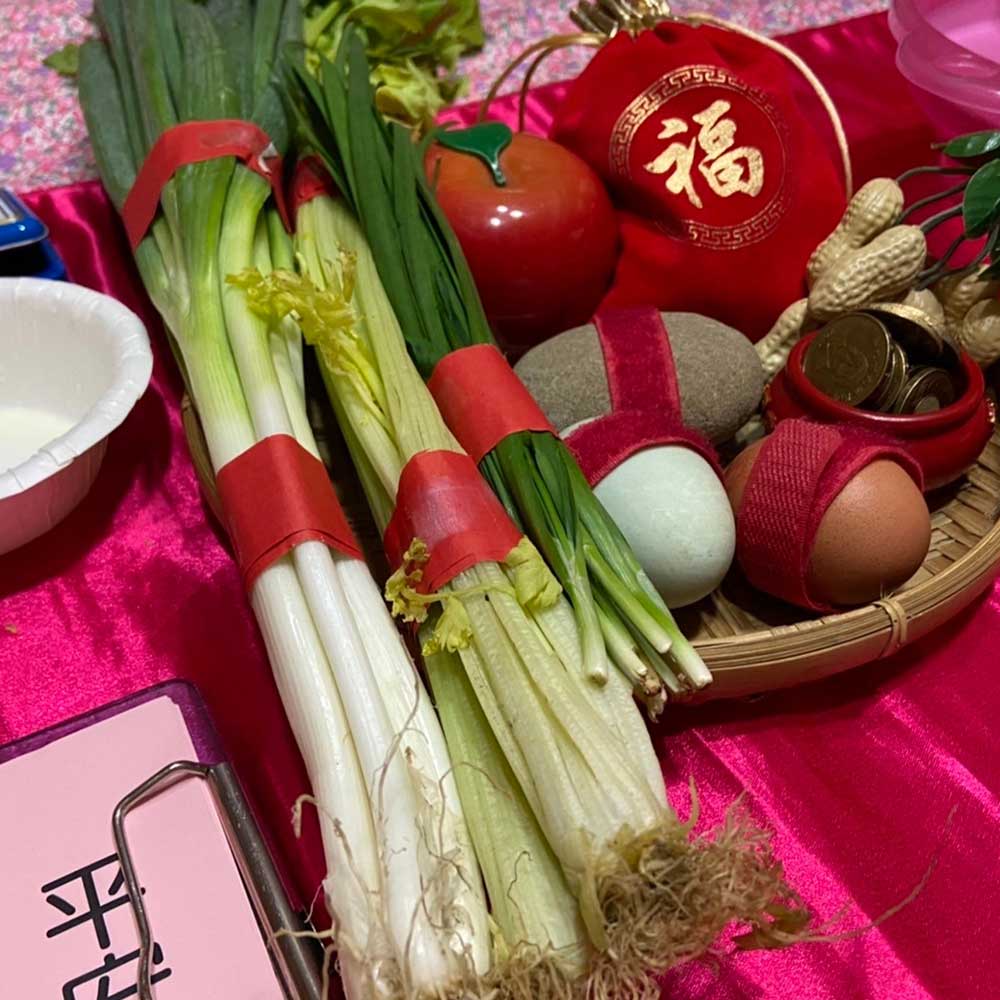 家長需要自行準備:(蔥、韭菜、芹菜、熟雞蛋、熟鴨蛋、石頭、銅板、臉盆、紗布巾)。附註:若家長需要我們幫忙準備,則需額外收備品費用。